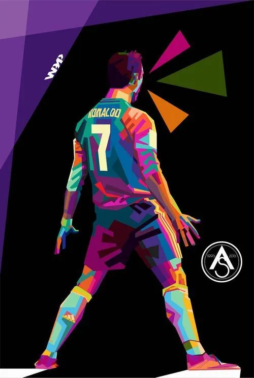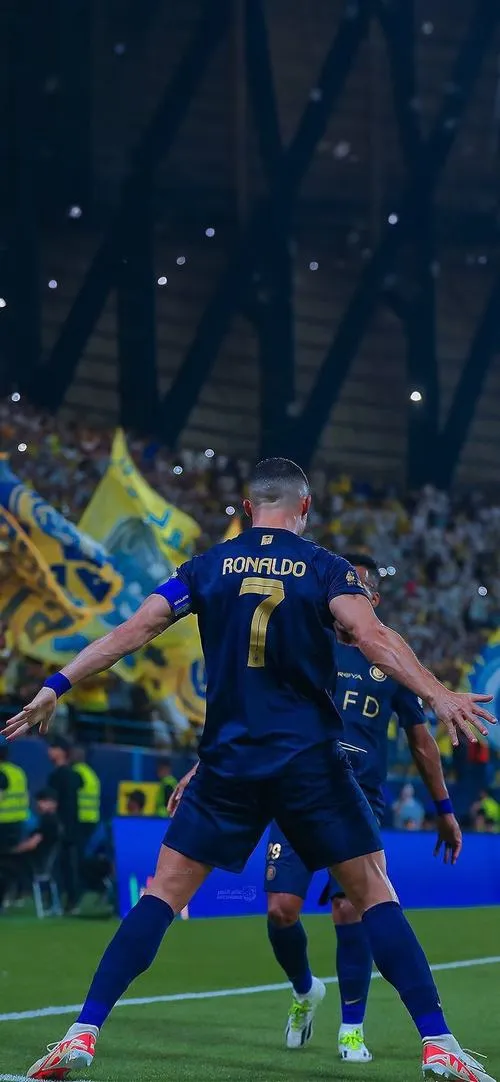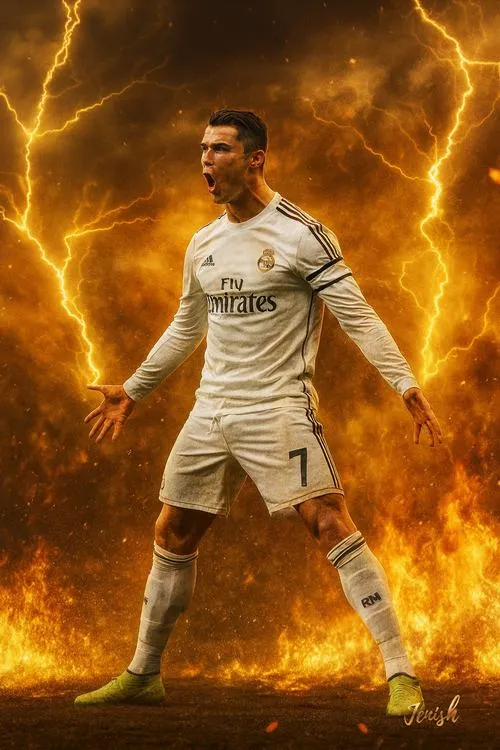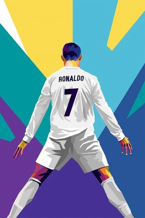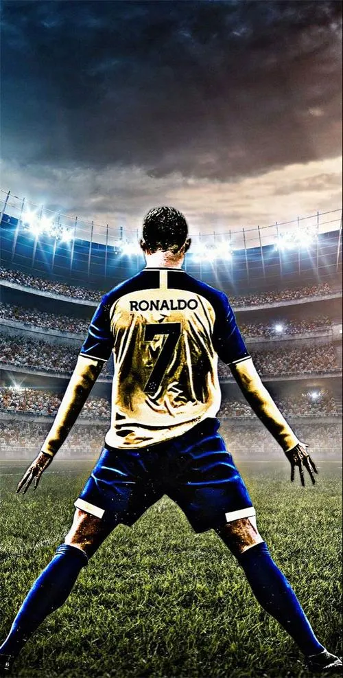Ảnh Ronaldo siu thường nổi bật ở chuyển động mạnh: chạy đà, bật nhảy, xoay người rồi tiếp đất chân dang rộng, hai tay vung xuống dứt khoát. Màu áo sáng nổi trên nền sân cỏ và khán đài mờ tạo tương phản rõ. Hợp ảnh sân vận động ban đêm, ảnh bắt nét nhanh, truyền cảm giác bùng nổ và áp đảo.